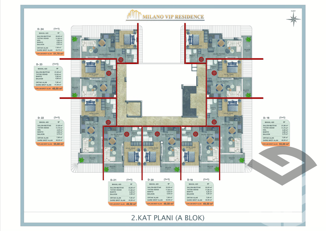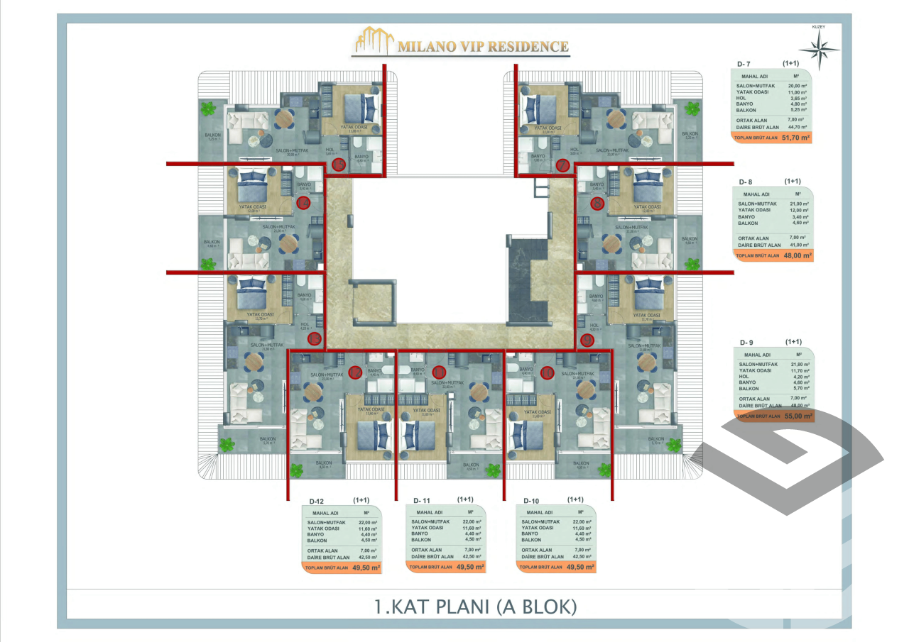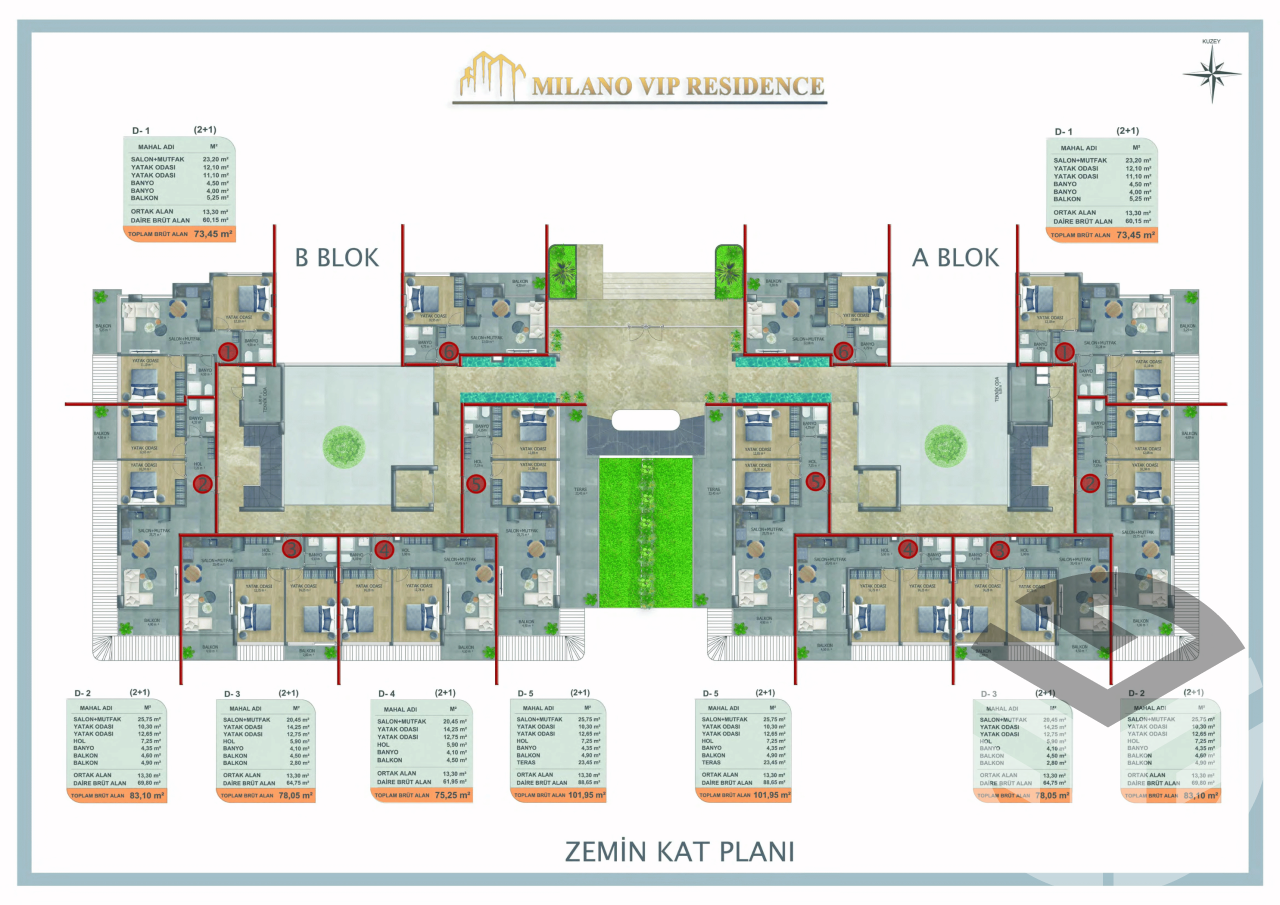 The residence includes 2 blocks, 60 apartments 1+1, 2+1, and duplexes 3+1.